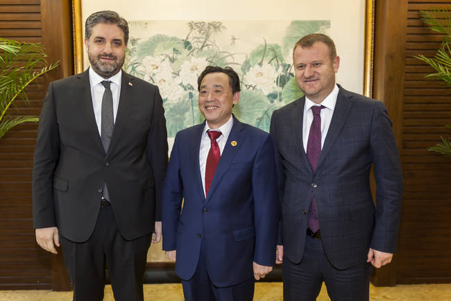 土耳其驻华大使埃明·约南(左)、农业部副部长屈冬玉(中)、土耳其共和国食品、农业和畜牧业部副部长麦赫迈特·丹尼诗(右),会见时合影。